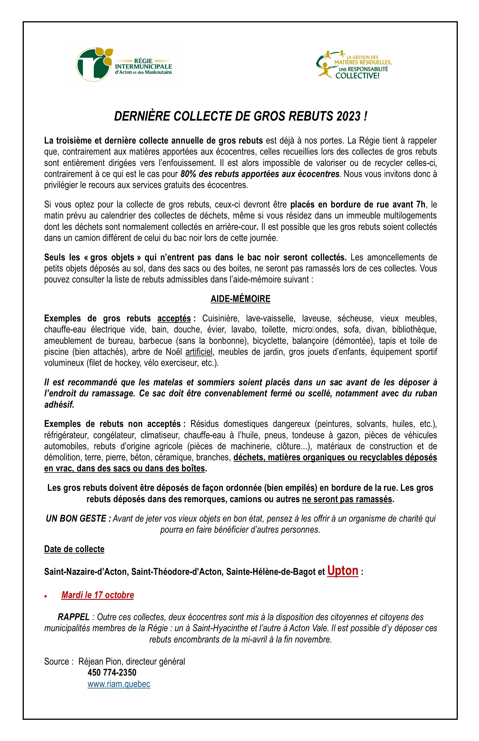 Dernière collecte de gros rebuts: mardi, le 17 octobre 2023 Upton2023-09-25T10:36:31-04:00 Partagez sur les réseaux sociaux FacebookXLinkedInPinterestEmail