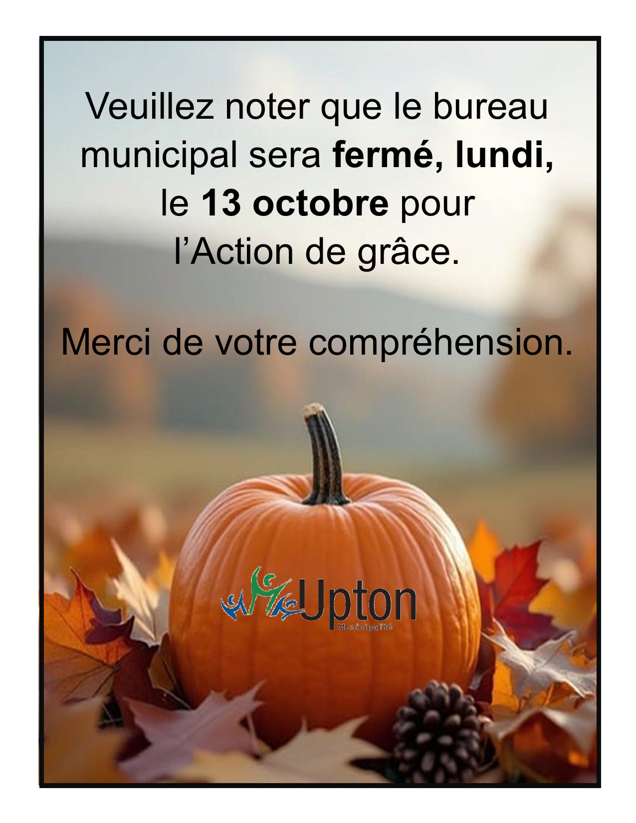 Action de grâce – bureau municipal fermé Upton2025-10-07T14:09:14-04:00 Partagez sur les réseaux sociaux FacebookXLinkedInPinterestEmail