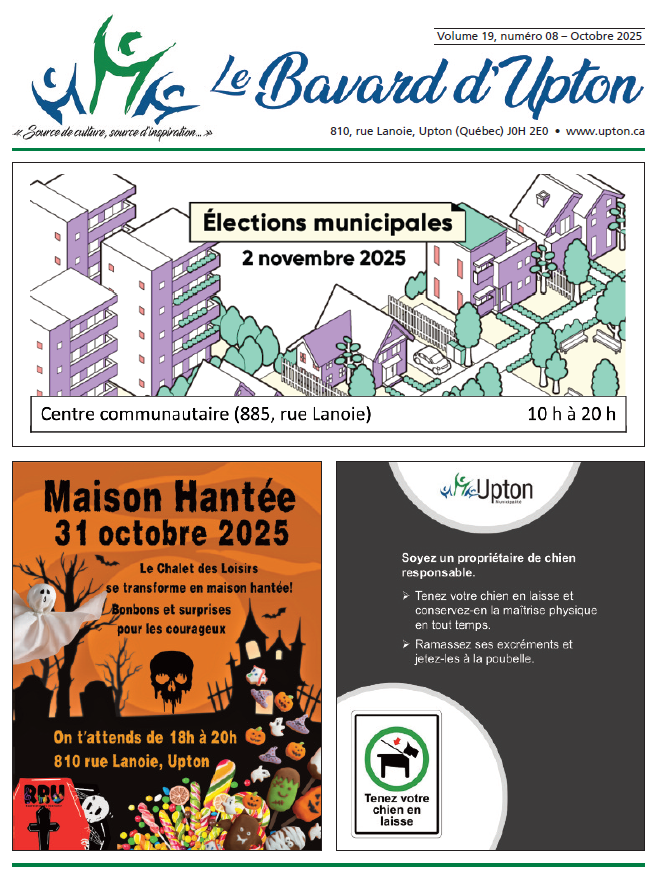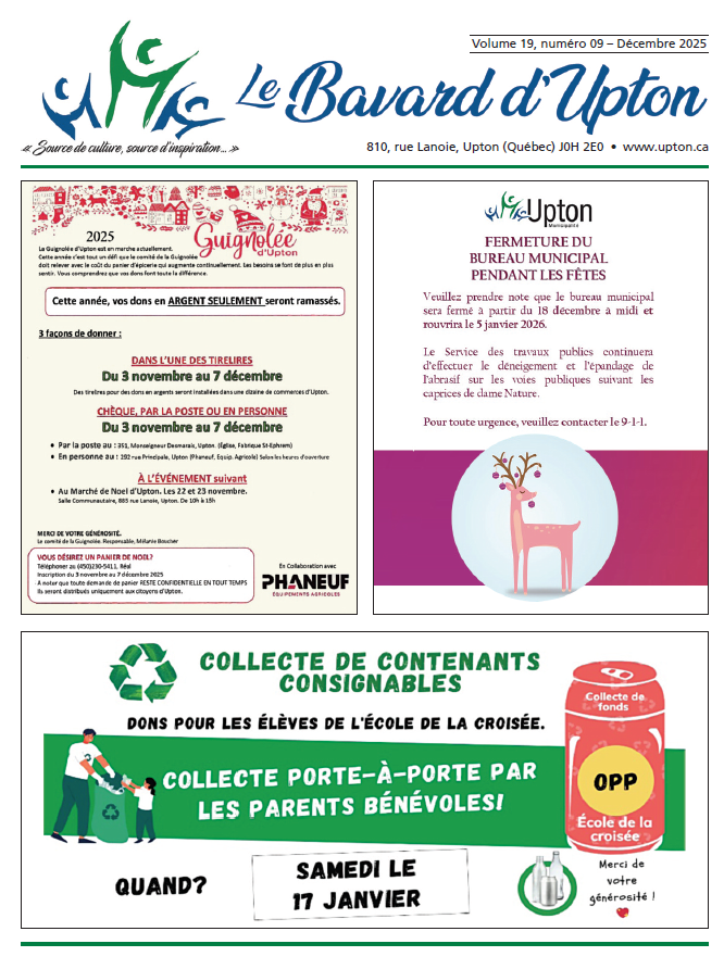 Le journal municipal « Le Bavard » est distribué mensuellement dans tous les foyers de la Municipalité. Vous y trouverez de l’information sur les activités organisées ainsi que les services offerts par la Municipalité et les organismes communautaires, les travaux d’infrastructures en cours de réalisation, les règlements municipaux, les avis publics ainsi que sur les assemblées du conseil municipal.
