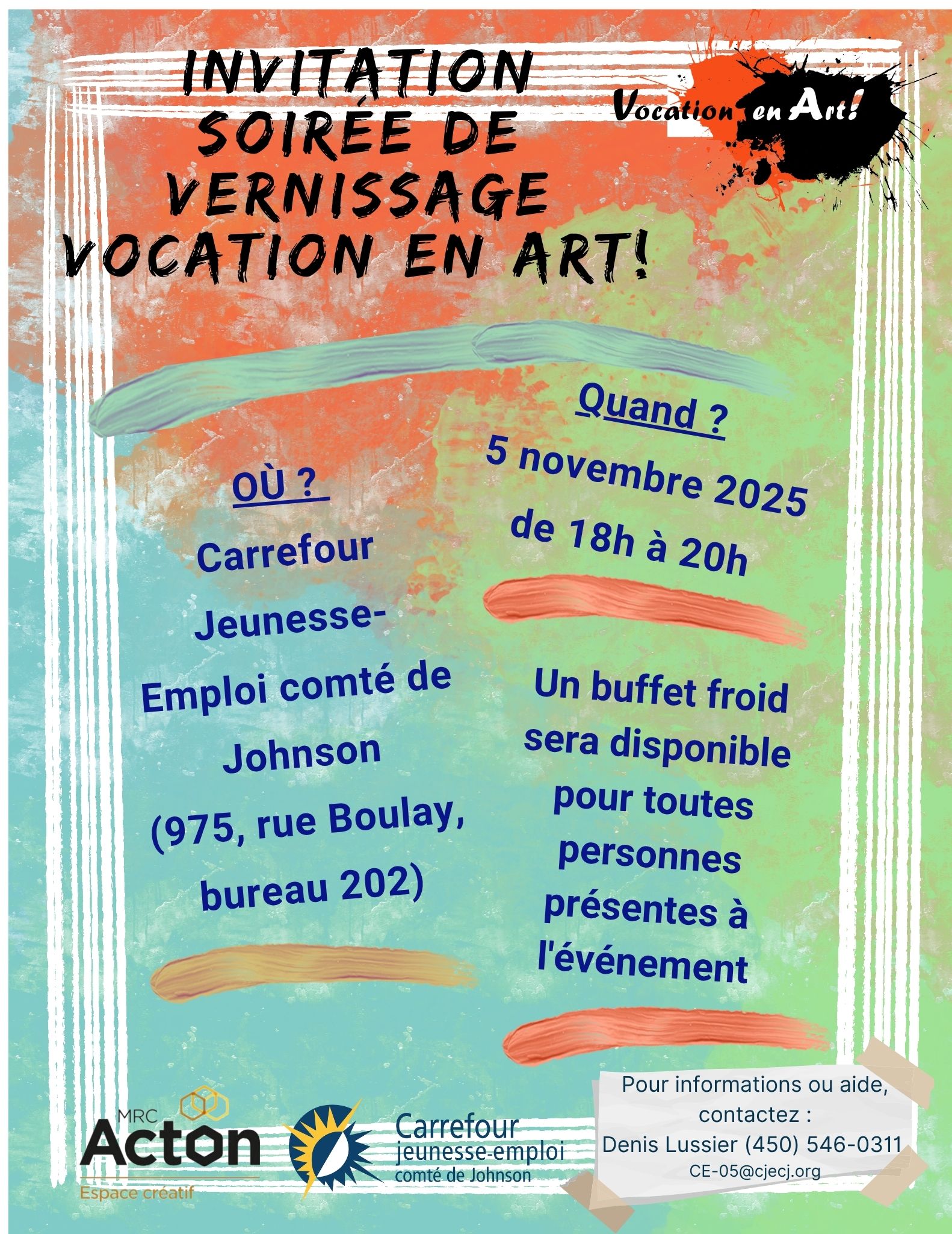 Carrefour- Jeunesse : INVITATION SOIRÉE DE VERNISSAGE VOCATION EN ART! Upton2025-10-14T16:55:06-04:00 Partagez sur les réseaux sociaux FacebookXLinkedInPinterestEmail