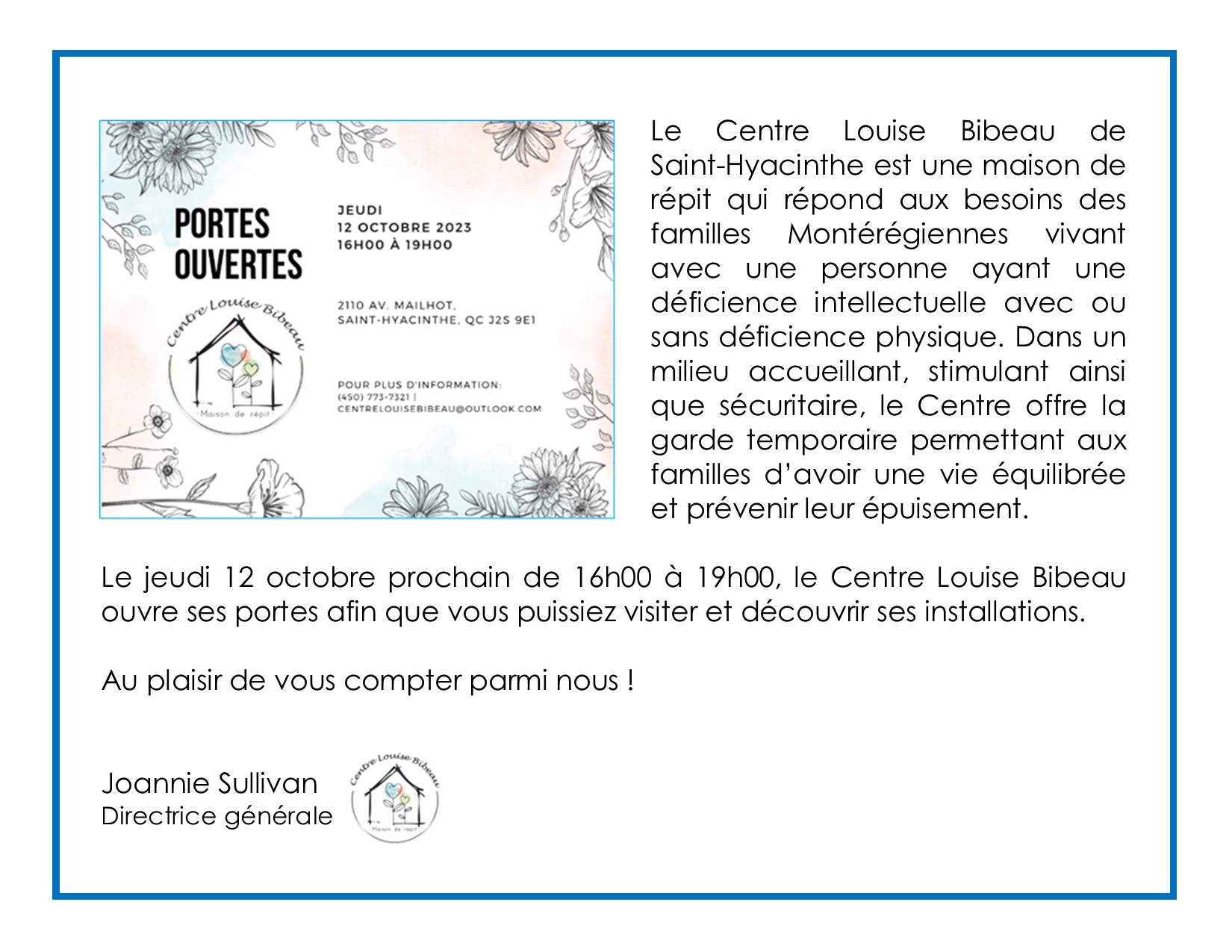 Centre Louise Bibeau (maison de répit) – Portes Ouvertes Upton2023-09-12T13:48:38-04:00 Partagez sur les réseaux sociaux FacebookXLinkedInPinterestEmail