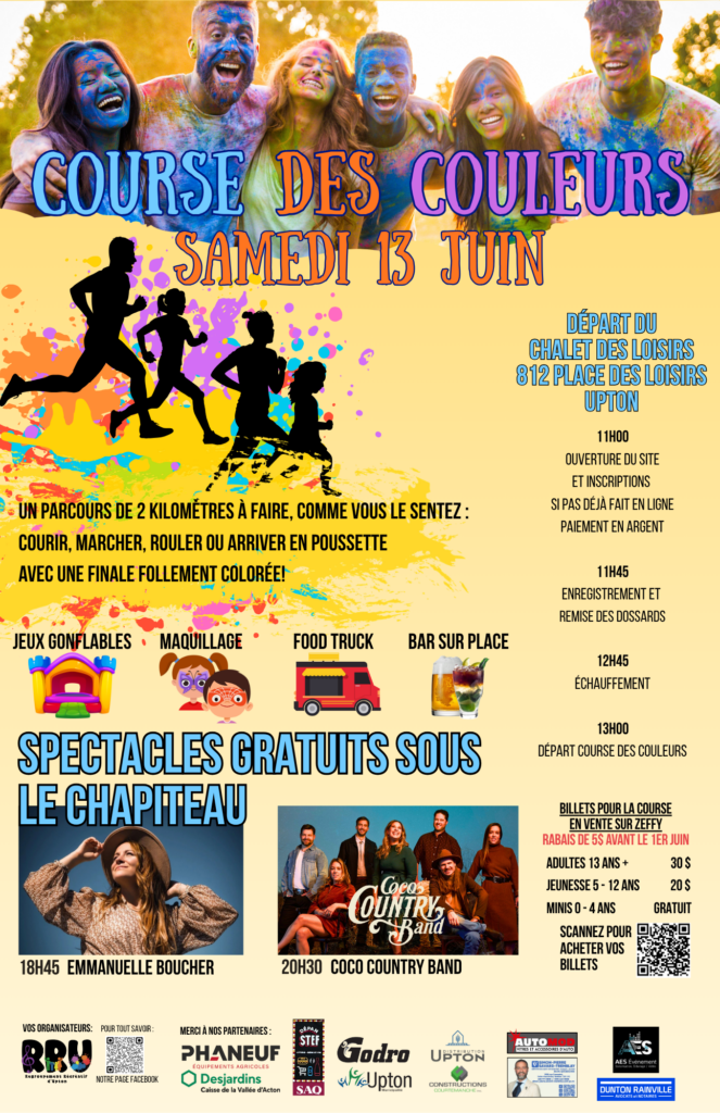COURSE DES COULEURS – SAMEDI 13 JUIN 2026 Émilie Hébert2026-04-15T09:46:24-04:00 Partagez sur les réseaux sociaux FacebookXLinkedInPinterestEmail