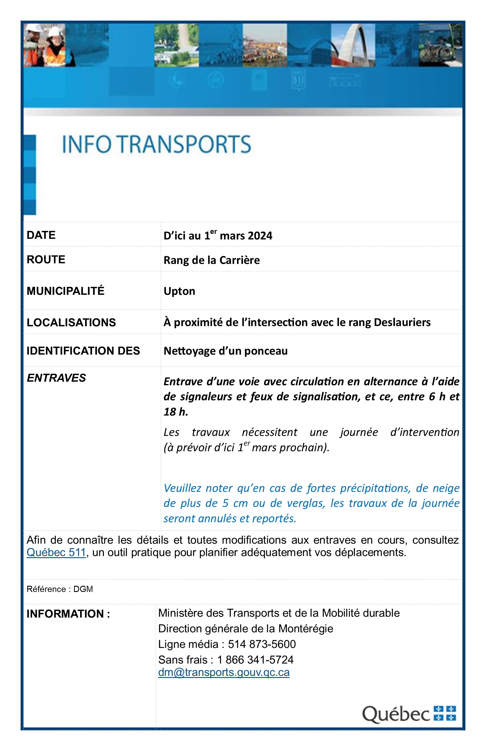 INFO TRANSPORTS- RANG DE LA CARRIÈRE Upton2024-02-26T10:35:14-05:00 Partagez sur les réseaux sociaux FacebookXLinkedInPinterestEmail