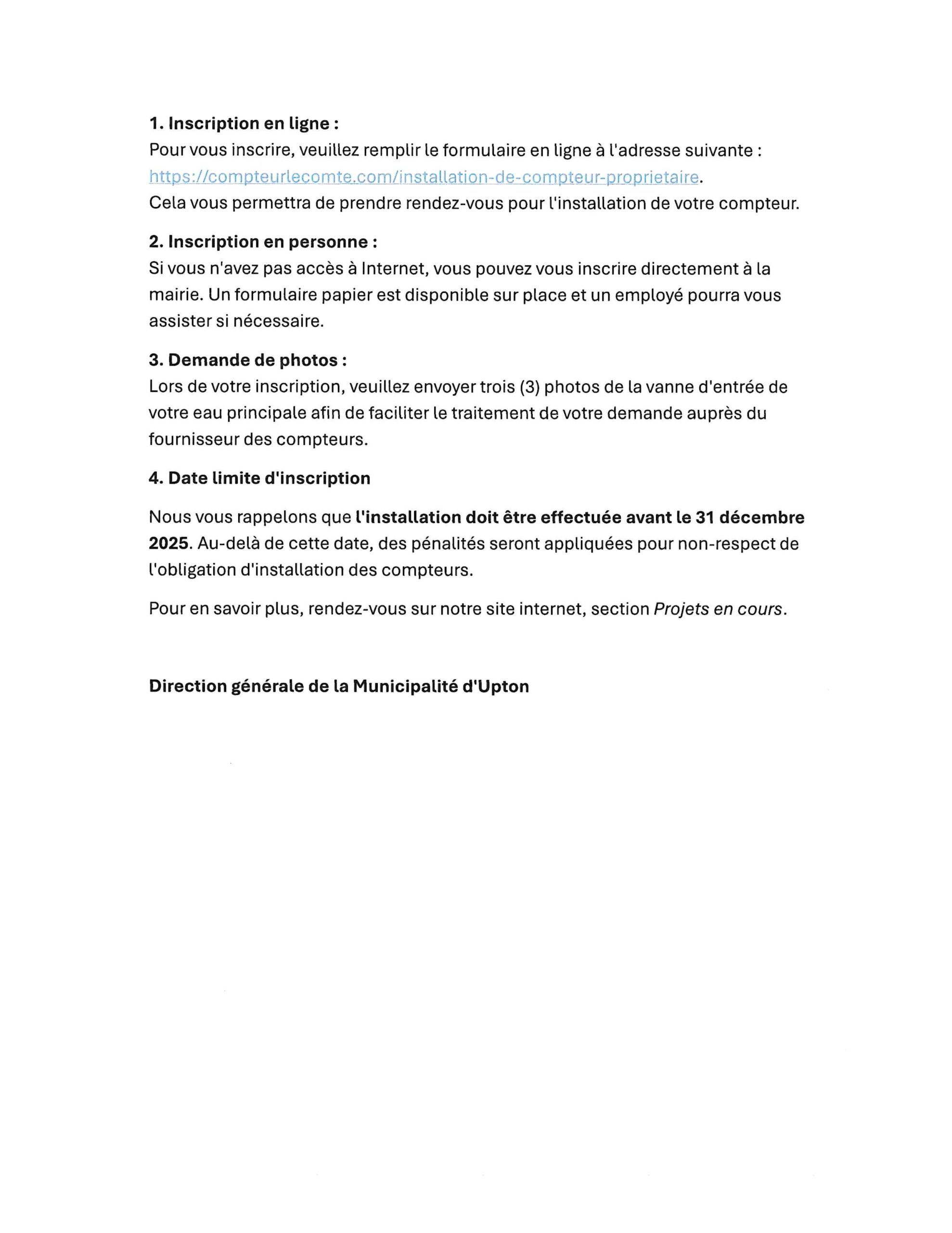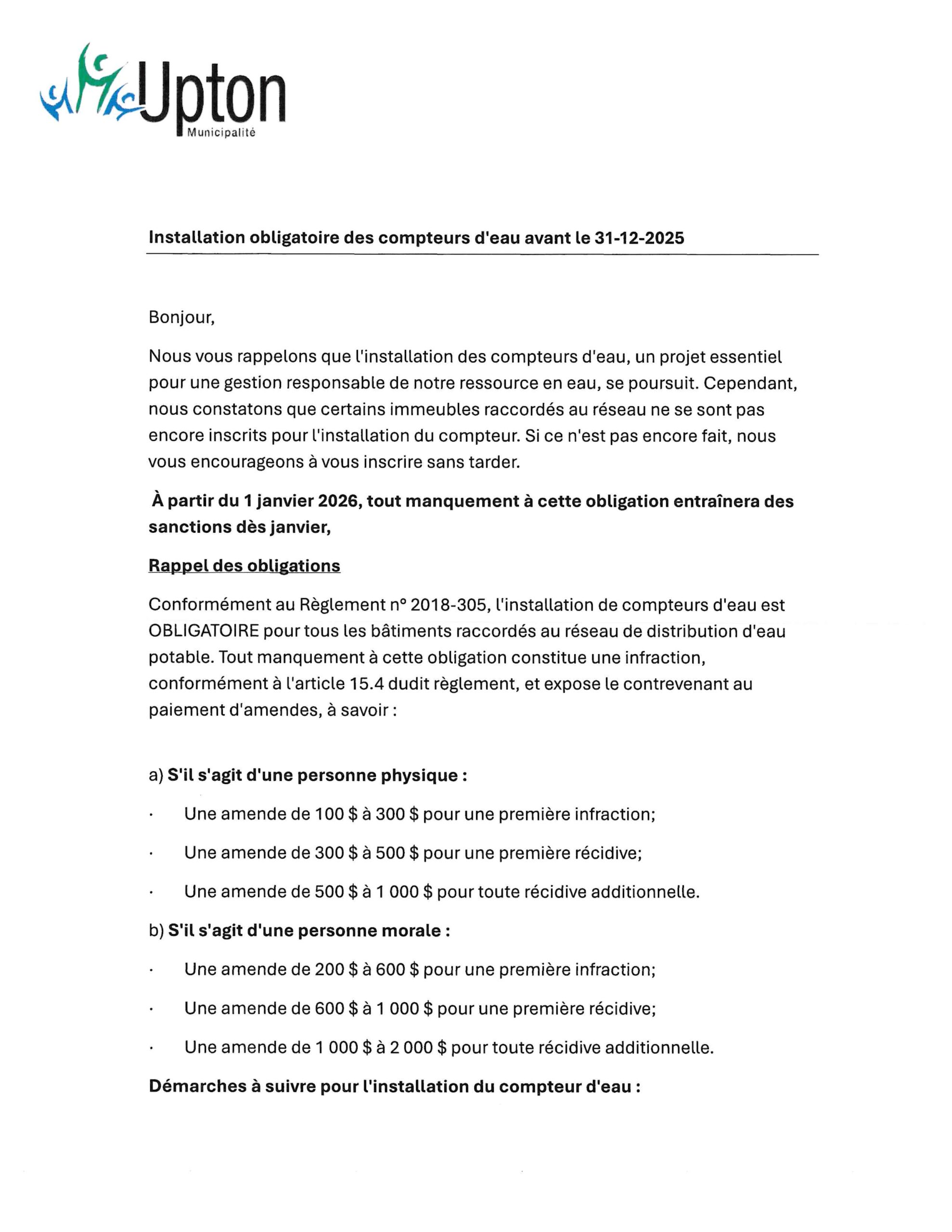 INSTALLATION OBLIGATOIRE DES COMPTEURS D’EAU AVANT LE 21-12-2025 Upton2025-10-06T10:48:40-04:00 Partagez sur les réseaux sociaux FacebookXLinkedInPinterestEmail