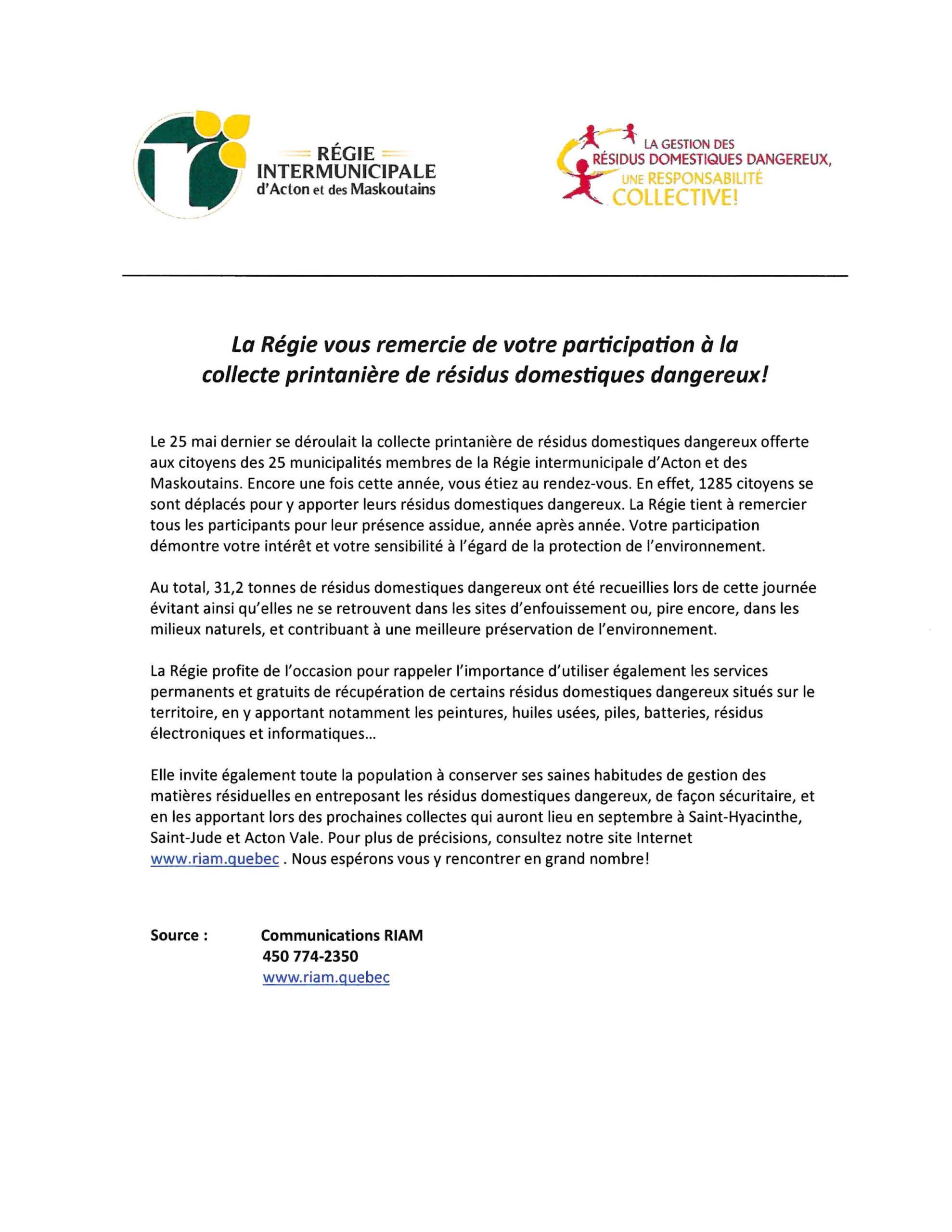La Régie vous remercie de votre participation à la collecte printanière de résidus domestiques dangereux! Upton2024-06-27T10:21:00-04:00 Partagez sur les réseaux sociaux FacebookXLinkedInPinterestEmail