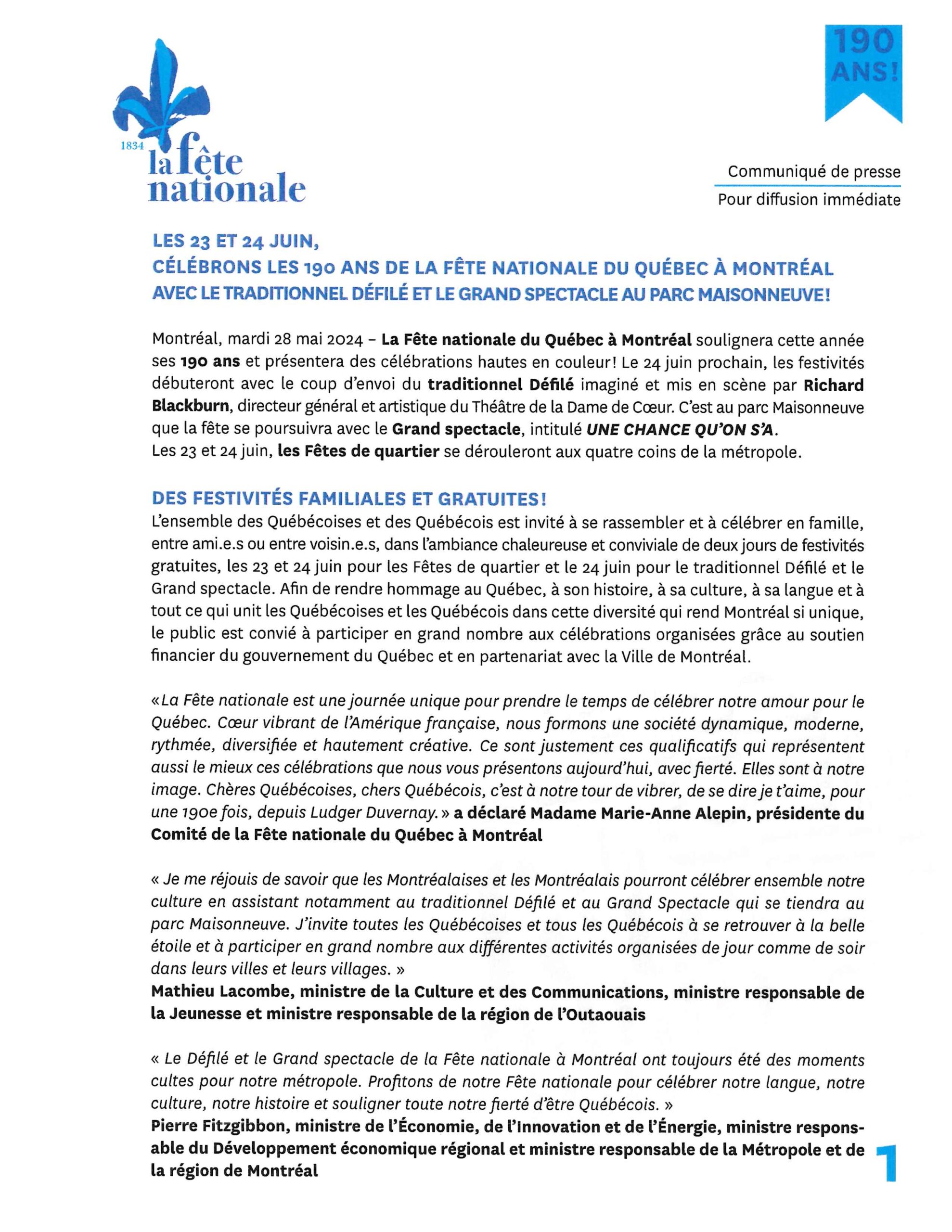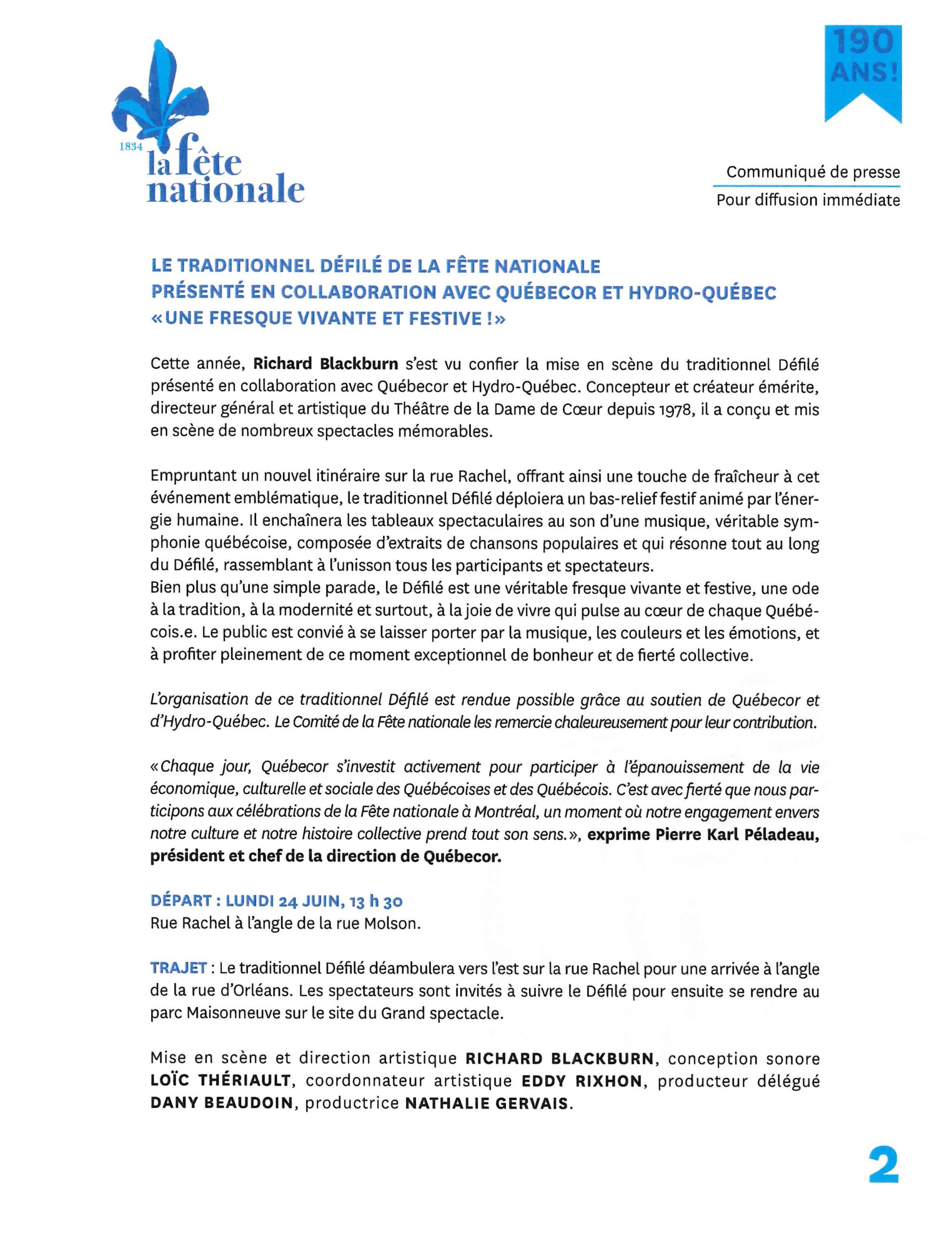 Le traditionnel défilé de la Fête nationale du Québec à Montréal est mis en scène par Richard Blackburn, directeur général et artistique du Théâtre de la Dame de Cœur. Quel honneur pour la région d’Acton !