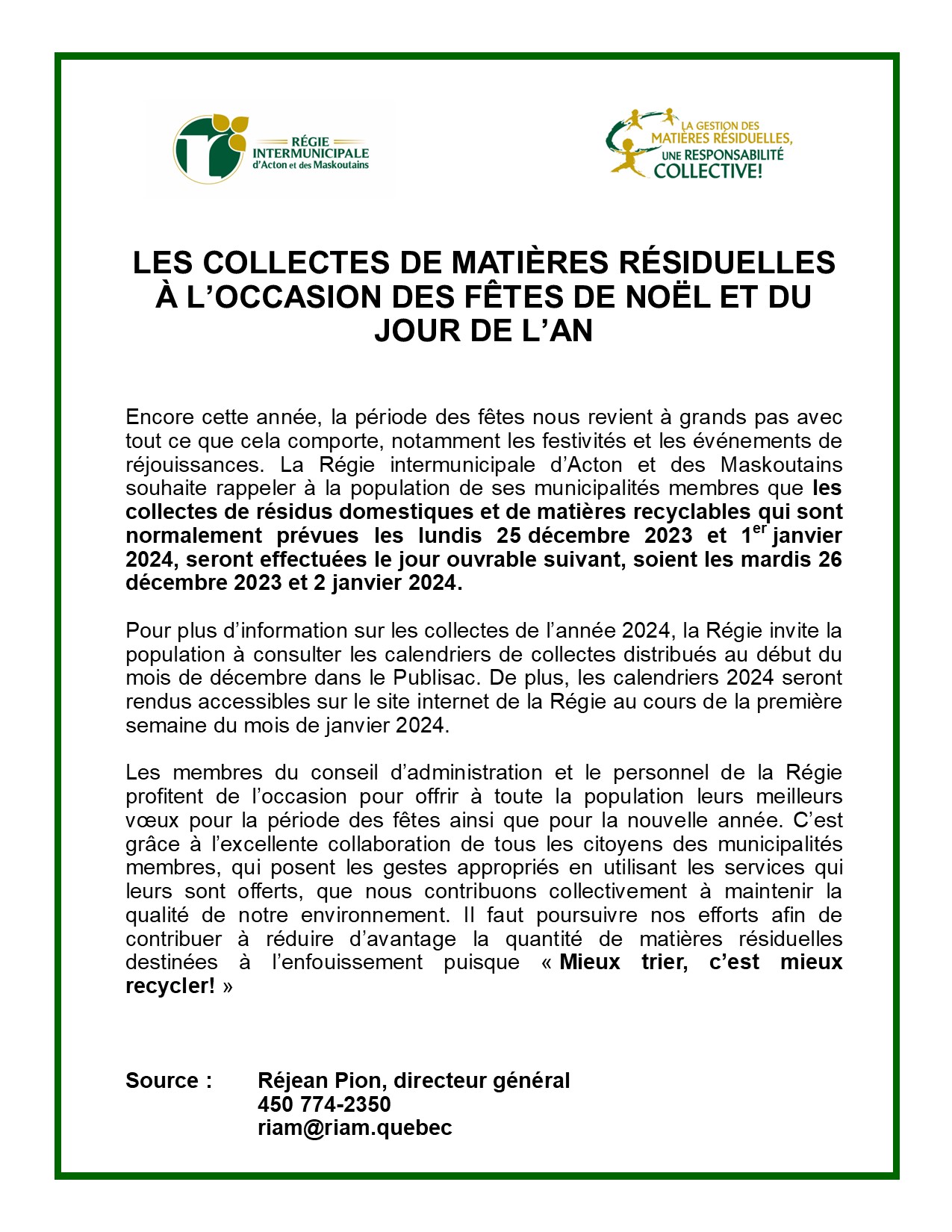 LES COLLECTES DE MATIÈRES RÉSIDUELLES À L’OCCASION DES FÊTES DE NOËL ET DU JOUR DE L’AN Upton2023-12-04T13:49:27-05:00 Partagez sur les réseaux sociaux FacebookXLinkedInPinterestEmail