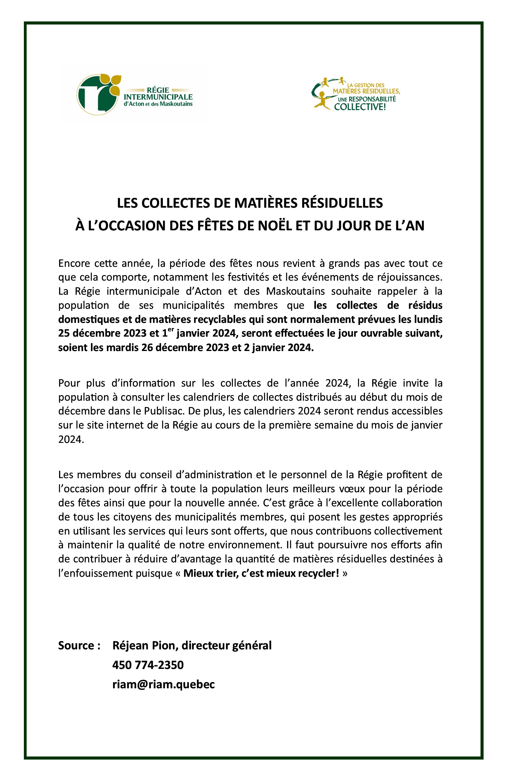 LES COLLECTES DE MATIÈRES RÉSIDUELLES À L’OCCASSION DES FÊTES DE NOËL ET DU JOUR DE L’AN Upton2023-11-30T08:46:33-05:00 Partagez sur les réseaux sociaux FacebookXLinkedInPinterestEmail