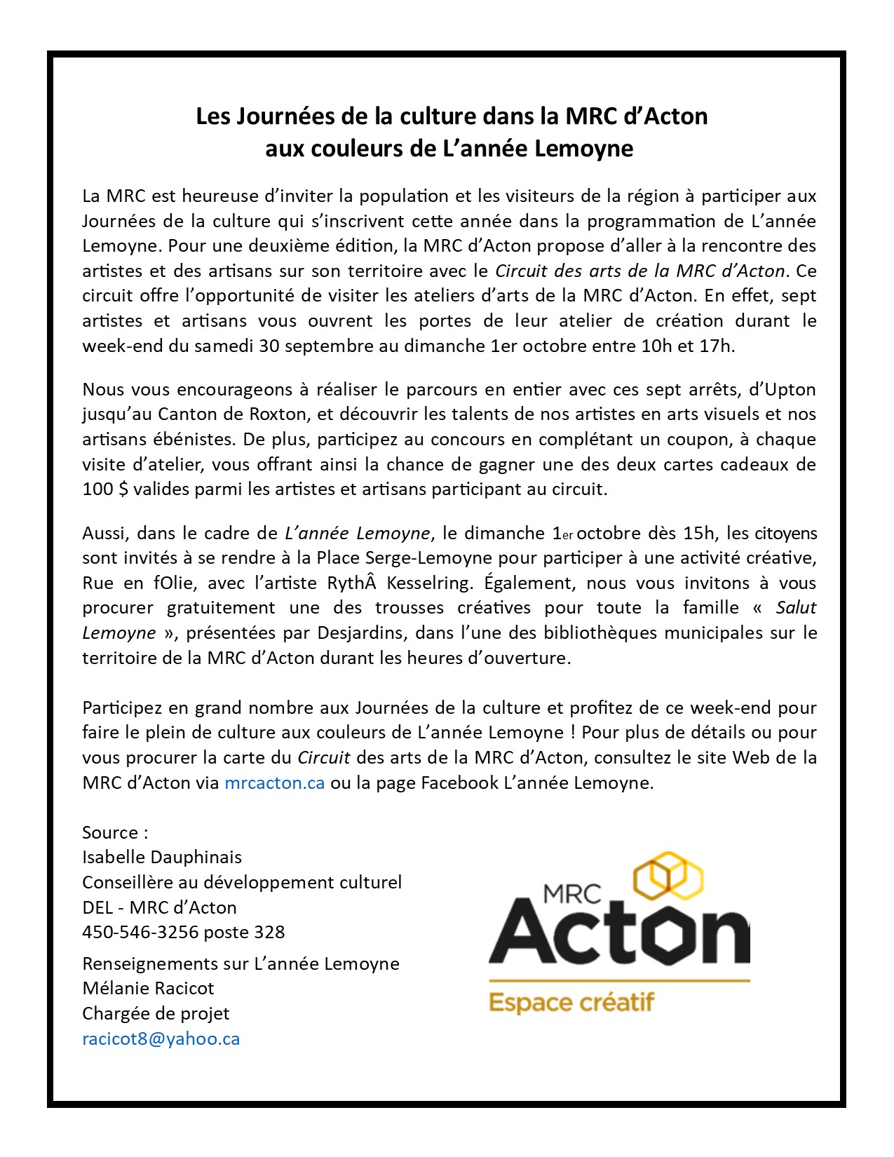Les journées de la culture dans la MRC d’Acton aux couleurs de L’année Lemoyne Upton2023-09-19T09:13:09-04:00 Partagez sur les réseaux sociaux FacebookXLinkedInPinterestEmail