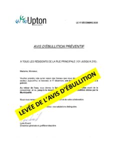LEVÉE DE L’AVIS D’ÉBULLITION – 101 à 215, rue Principale : Vous pouvez consommer l’eau potable sans restriction. Émilie Hébert2025-12-22T11:05:10-05:00 Partagez sur les réseaux sociaux FacebookXLinkedInPinterestEmail