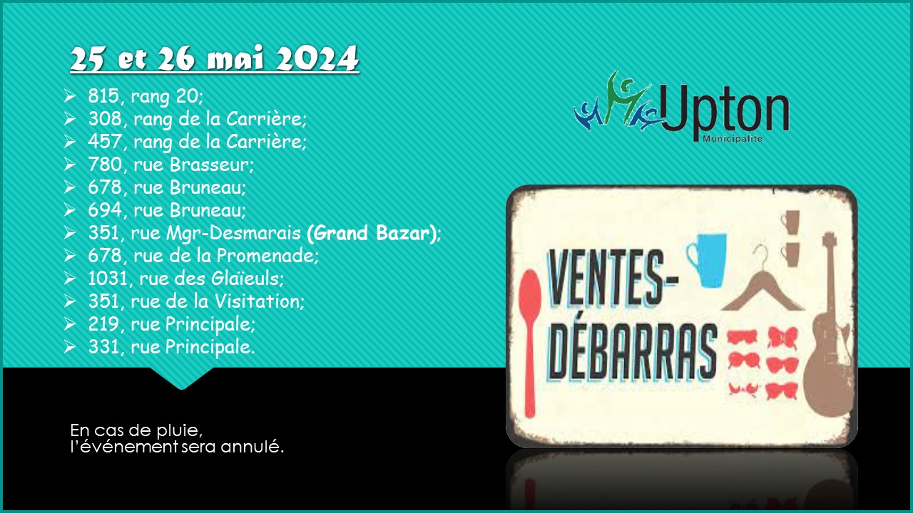 liste des ventes-débarras du 25 et 26 mai 2024 Upton2024-05-23T13:32:40-04:00 Partagez sur les réseaux sociaux FacebookXLinkedInPinterestEmail