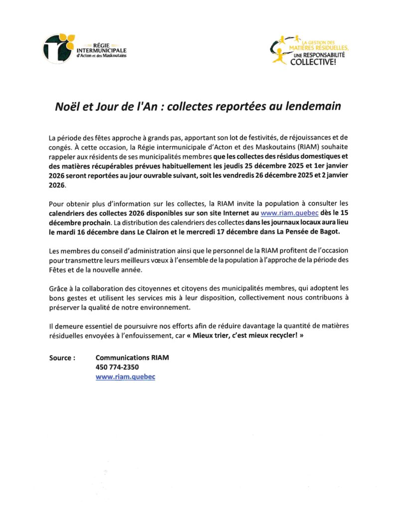 Noël et Jour de l’An: Collectes reportées au lendemain Émilie Hébert2025-12-10T16:01:35-05:00 Partagez sur les réseaux sociaux FacebookXLinkedInPinterestEmail