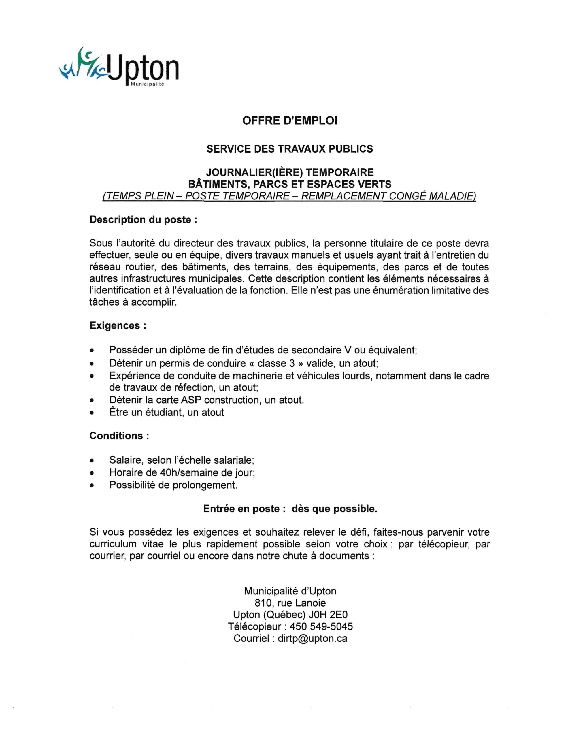 Offre d’emploi – SERVICE DES TRAVAUX PUBLICS Upton2025-11-05T09:16:40-05:00 Partagez sur les réseaux sociaux FacebookXLinkedInPinterestEmail