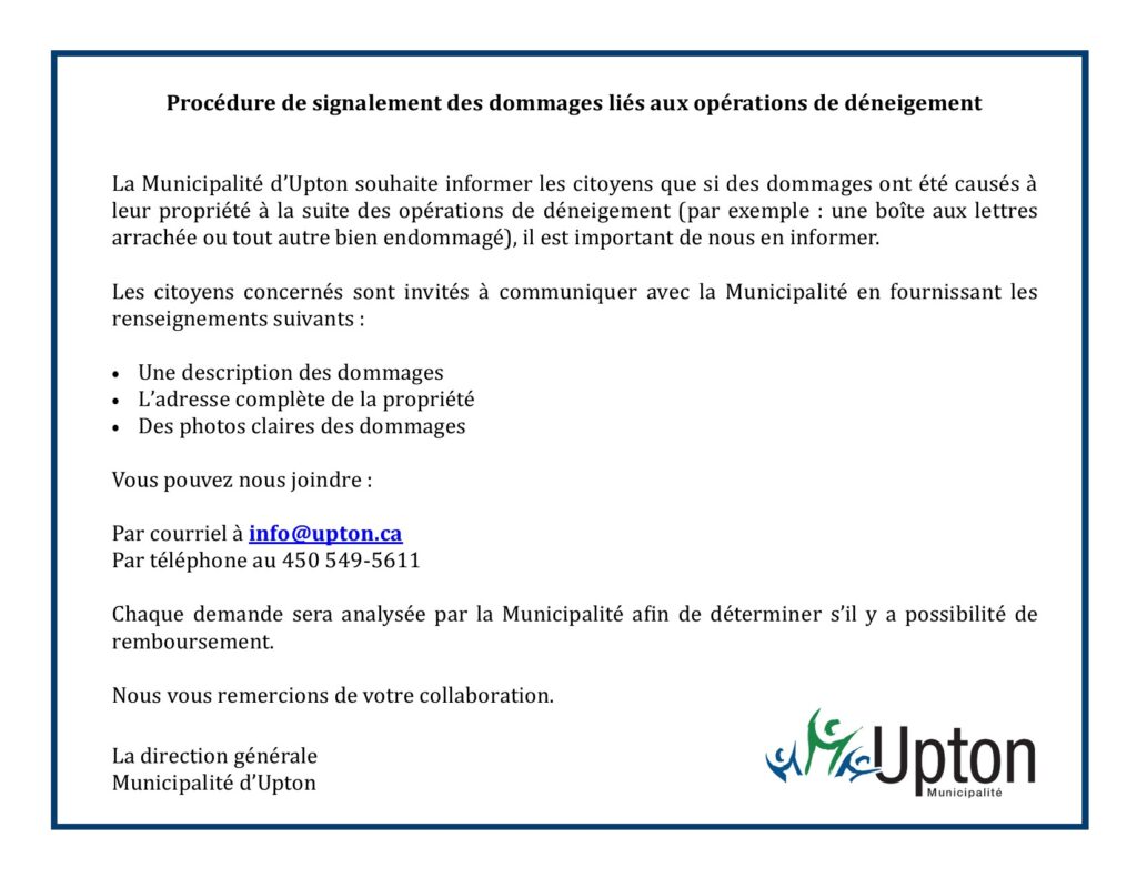 Procédure de signalement des dommages liés aux opérations de déneigement Émilie Hébert2026-02-04T13:41:23-05:00 Partagez sur les réseaux sociaux FacebookXLinkedInPinterestEmail