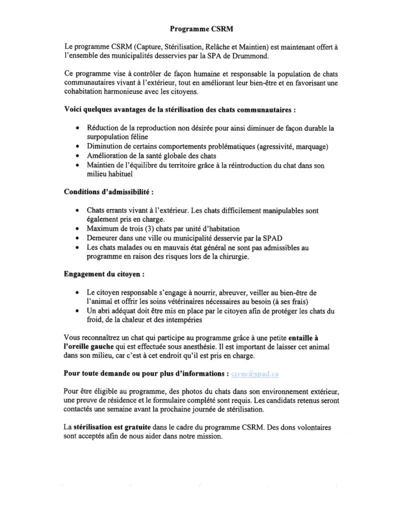 Programme CSRM (Capture, Stérilisation, Relâche et Maintien) – chats Émilie Hébert2026-01-27T11:33:56-05:00 Partagez sur les réseaux sociaux FacebookXLinkedInPinterestEmail
