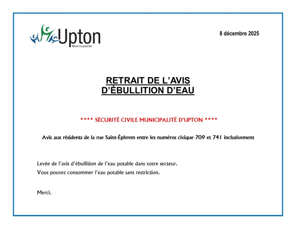Retrait de l’avis d’ébullition – 709 à 741 (inclusivement), rue Saint-Éphrem Émilie Hébert2025-12-08T11:20:35-05:00 Partagez sur les réseaux sociaux FacebookXLinkedInPinterestEmail