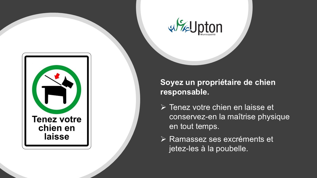 Soyez un propriétaire de chien responsable! Upton2025-10-15T14:59:06-04:00 Partagez sur les réseaux sociaux FacebookXLinkedInPinterestEmail