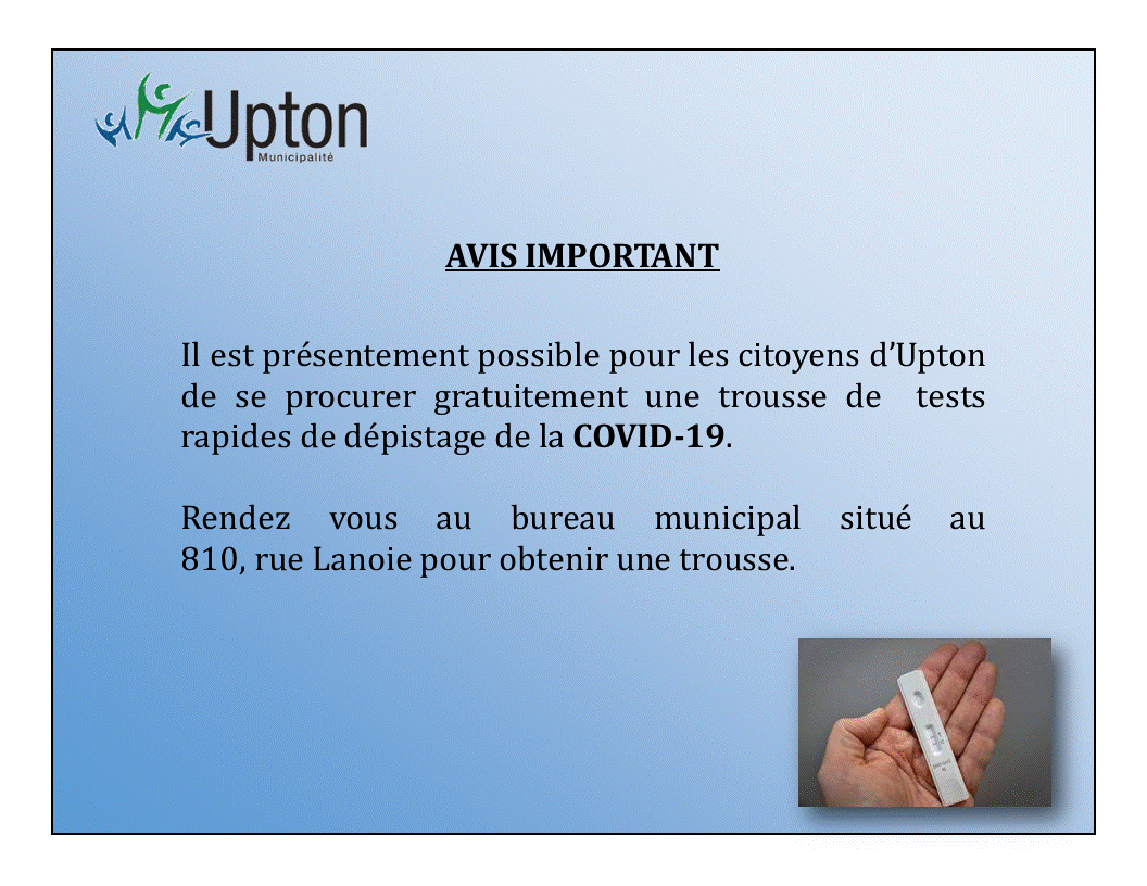 TROUSSES DE TESTS DE DÉPISTAGE DE LA COVID-19 À OFFRIR AUX CITOYENS Upton2024-02-19T09:57:51-05:00 Partagez sur les réseaux sociaux FacebookXLinkedInPinterestEmail