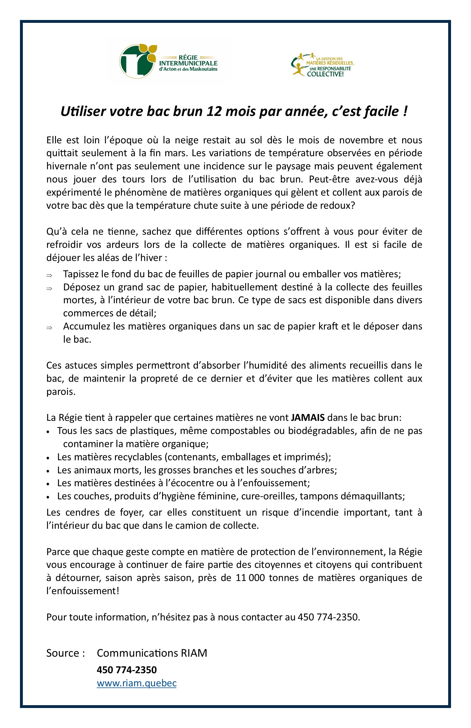 Utiliser votre bac brun 13 mois par année, c’est facile! Upton2024-01-09T10:51:46-05:00 Partagez sur les réseaux sociaux FacebookXLinkedInPinterestEmail