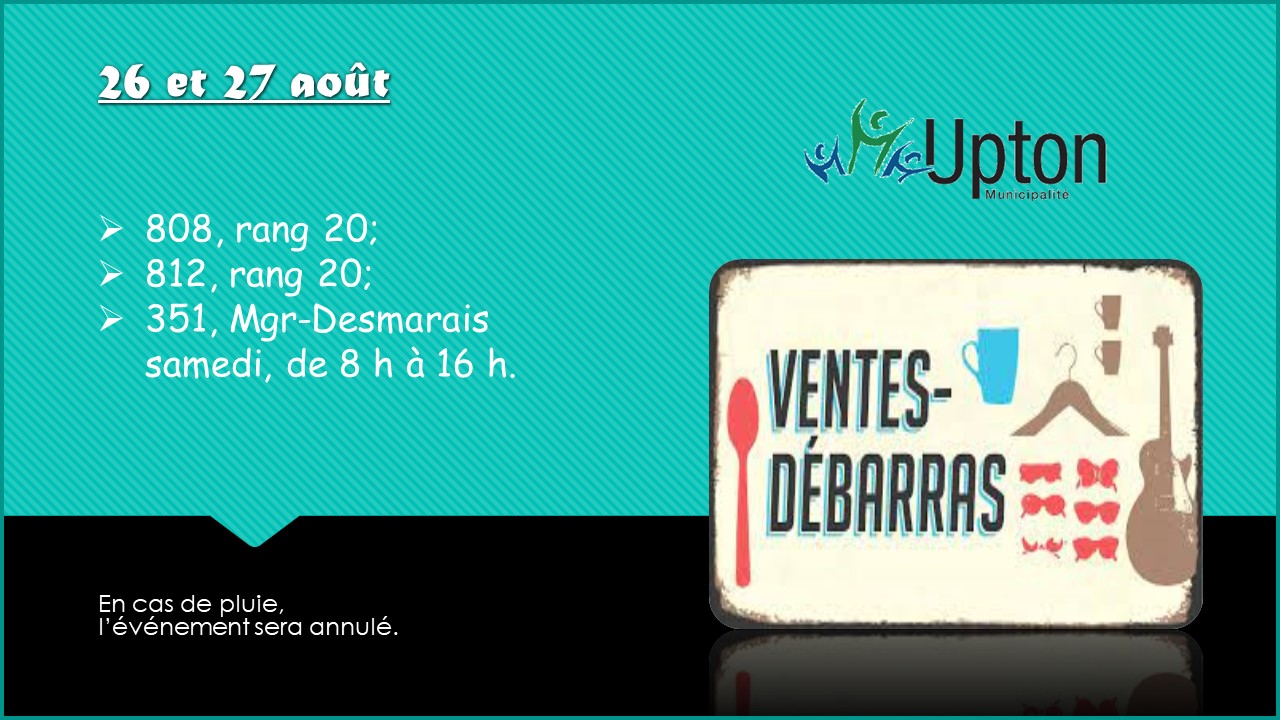 VENTES-DÉBARRAS – 26 ET 27 AOÛT 2023 Upton2023-08-17T11:31:21-04:00 Partagez sur les réseaux sociaux FacebookXLinkedInPinterestEmail